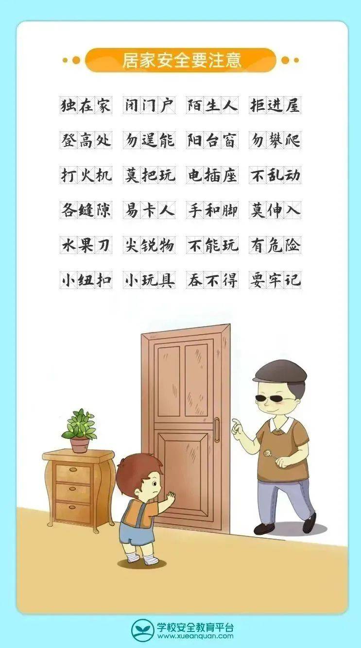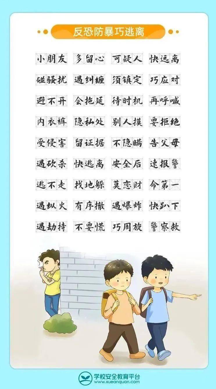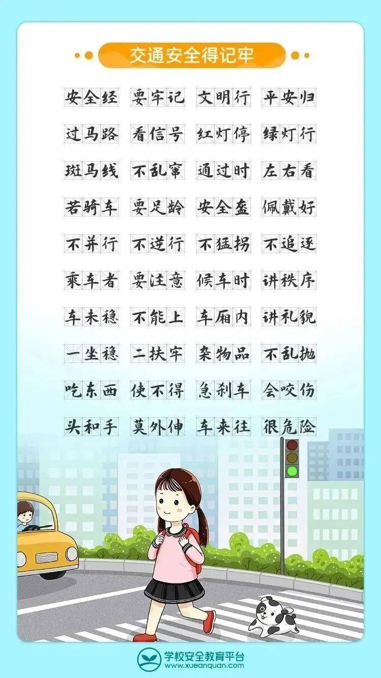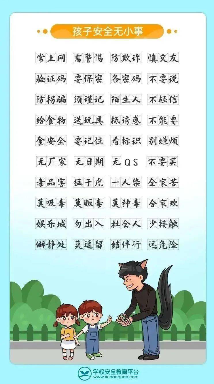 为切实加强校园安全教育,提高广大中小学生安全防范意识和自我防护能力, 在全国中小学生安全教育日来临之际,安全君 特为大家准备了 安全教育三字经, 让我们一起学习安全知识,护航孩子安全成长!