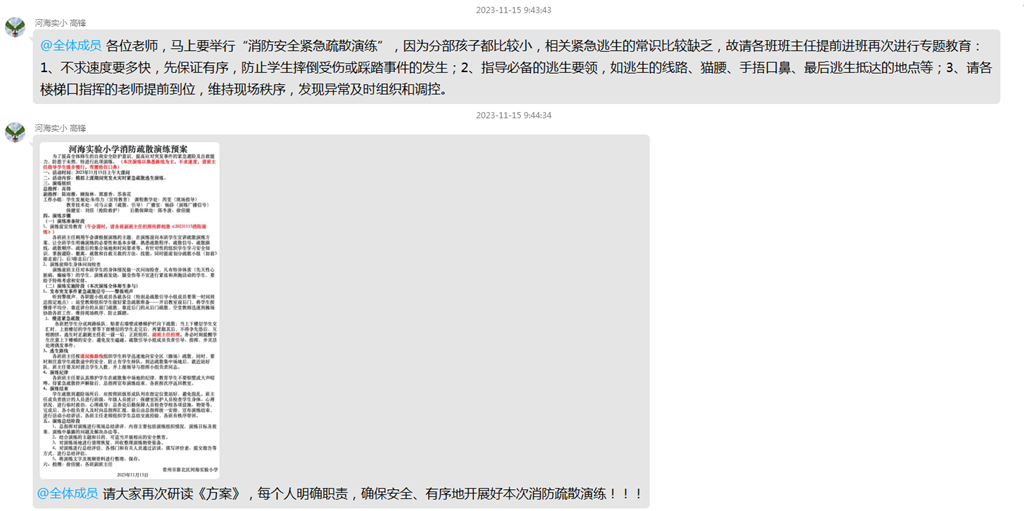 为进一步提高全体师生对火灾的防范意识,掌握在火灾中迅速逃生、自救互救的基本技能,在我国第32个全国消防日来临之际,河海实验小学两校区于11月15日开展了消防安全疏散演练。