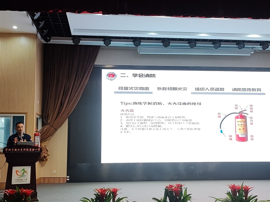 在培训过程中,宣传员——消防救援大队梁副大队长从“消防安全典型案例、了解火灾常识、校园消防安全注意事项、消防设施设备、灭火器的使用方法”等方面向全体教师介绍了日常生活中应该熟悉了解的消防安全知识。并详细讲解了如何扑救初期火灾、如何报警求助、如何辨别灭火器是否合格、如何正确地使用灭火器灭火,重点讲解了灭火逃生的方式方法,老师们听得十分认真,踊跃回答宣传员提出的消防安全相关问题。宣传人员还结合家庭、校园等学生常处的场所特点,就怎样查找火灾隐患、怎样预防火灾事故的发生、发生火灾时如何正确处理、日常消防安全标志的识别等方面进行了讲解。